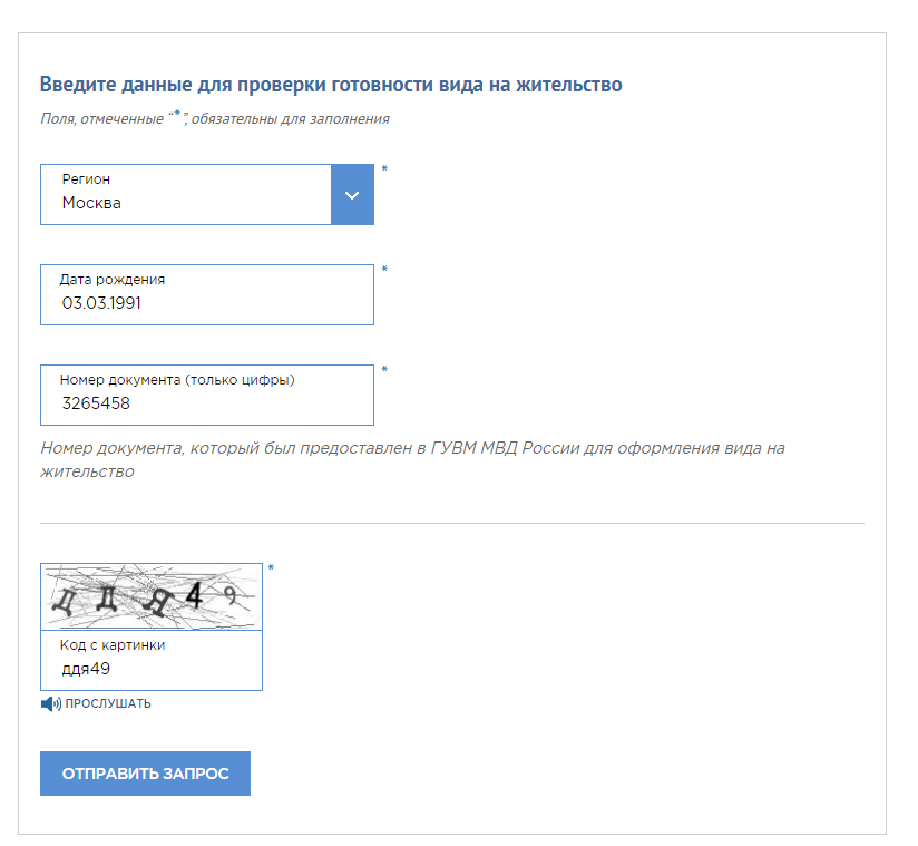 - В открывшейся форме введите необходимые сведения. Это не займет много времени, нужно указать следующие данные: регион, в котором подавалось заявление; дату рождения; номер документа, который был выдан в Управлении для оформления РВП. Фамилию, имя, отчество в сервисе не нужно прописывать.