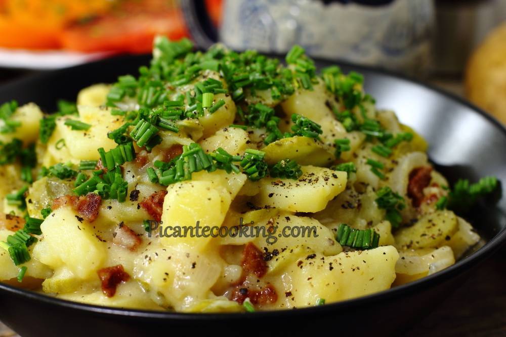 – это очень популярное блюдо, как в Германии, так и в Австрии. Блюдо распространенное, простонародное и очень вкусное. В нашей семье я не редко готовлю немецко-австрийский картофельный салат, поскольку мы его очень любим, а для моего мужа, это еще и вкус детства. Моя свекровь, наполовину немка, раньше часто готовила этот салат дома, так, как это делала ее мама немка. Баварская версия картофельного салата несколько отличается от немецко-австрийской версии. Делается этот салат на копченом беконе, шпеке, как его называют баварцы, а не на колбасках и в салат добавляются маринованные огурцы. И это один из лучших картофельных салатов который приходилось мне делать или пробовать. Я даже не думала, что маринованные огурцы так обогатят этот салат свежестью вкуса и разнообразят консистенцию своим хрустом.
