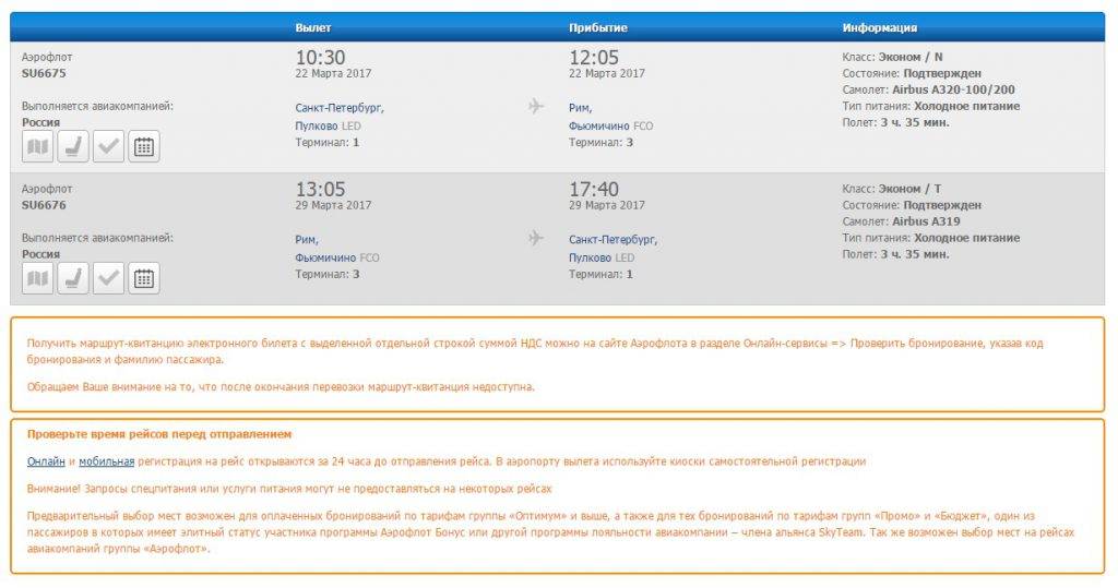 Ниже по экрану располагается детальная информация по рейсам, аэропортам и времени вылета/прилета, классам бронирования, типу обслуживания на борту, типу воздушного судна, типу питания, времени в полете.