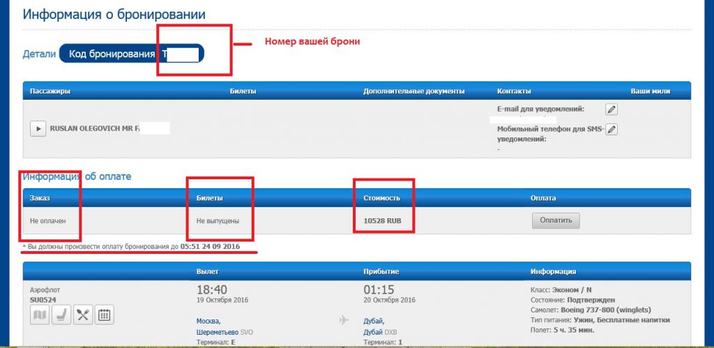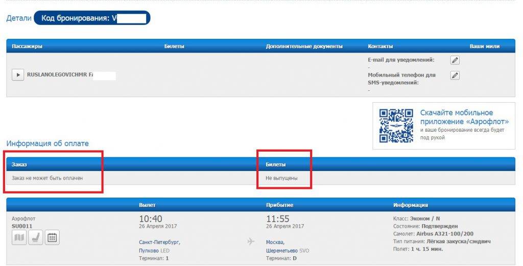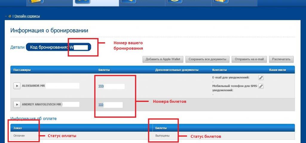 На странице “Информация о бронировании” отображаются данные о всех пассажирах в брони, номера авиабилетов (у Аэрофлота начинаются с 555), статусе заказа (оплачен/не оплачен), статусах авиабилетов (выпущен/не выпущен).