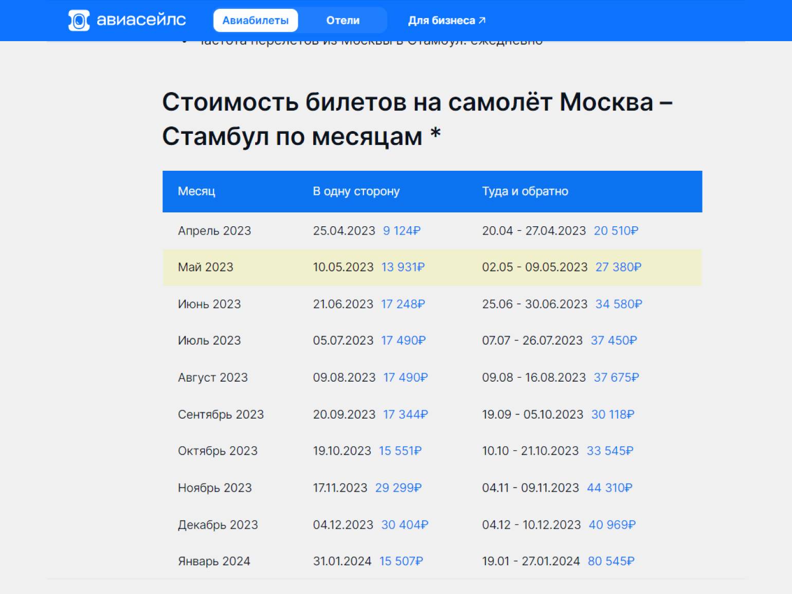 Из России в Турцию перевозят несколько авиакомпаний, в их числе Turkish Airlines, «Аэрофлот» и «Победа». По данным аналитиков сервиса путешествий «Туту», средняя стоимость билета в этом году весной-летом снизилась на 13%. По отдельным направлениям, например Москва — Стамбул или Сочи — Стамбул, билеты и вовсе подешевели на треть. Стоимость билетов в Анталию снизилась на четверть.