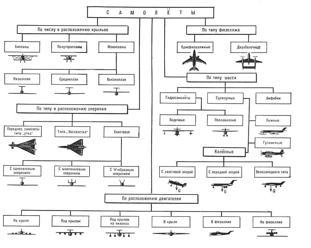 . Здесь перечислим различия по аэродинамической модели, числу и виду крыла, форме оперения хвостовой части, устройству фюзеляжа. К последней подгруппе относят и разновидности, которые касаются типов и крепления шасси.