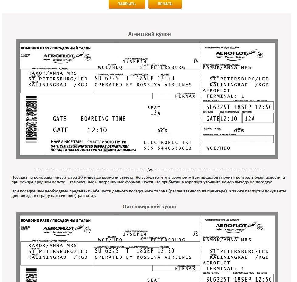 Посадочный талон в распечатанном виде — обязательное условие для полета. Распечатать талон можно как на собственном принтере, так и на листе А4 в киоске, на стойке регистрации или на печатном терминале аэропорта.