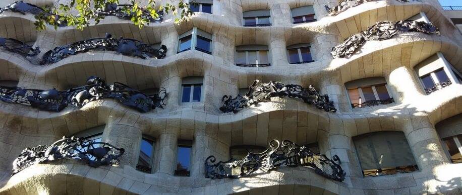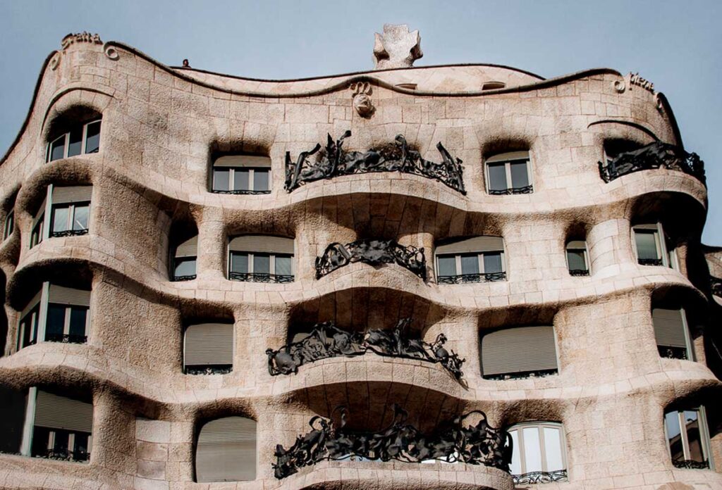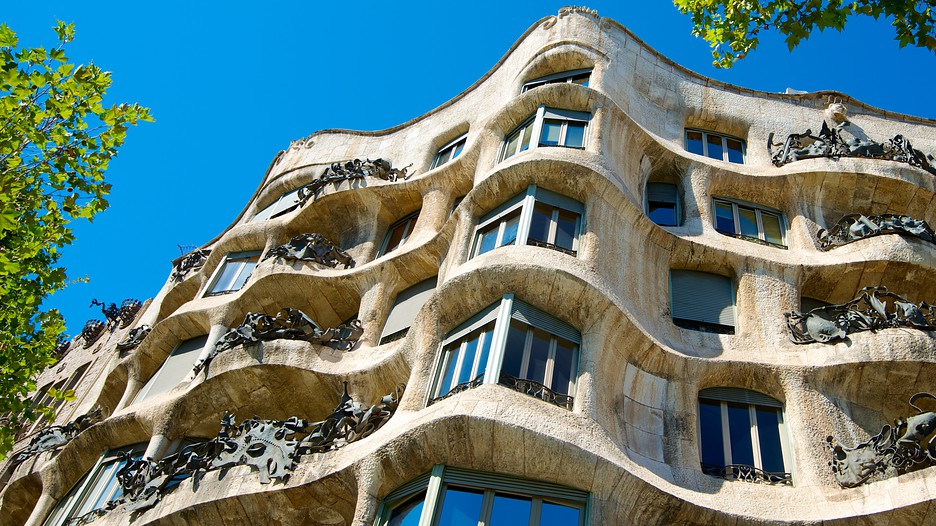 Дом Мила с первого взгляда поражает тяжеловесностью и асимметрией фасада, отделанного каменными плитами, добытыми на холме Монтжуик. Волнообразные линии и отсутствие прямых углов вызывают ассоциации с морем и стихией, а все строение кажется наполненным движением и жизнью.