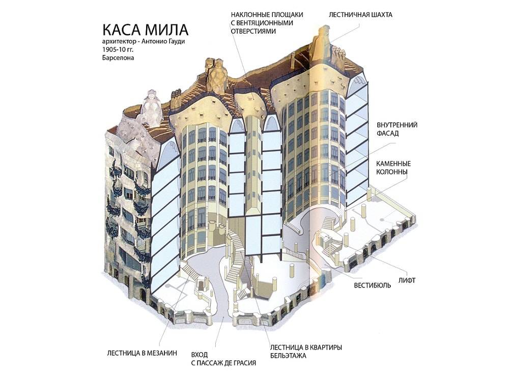 Дом построен на месте храма Девы Марии XI в., и поэтому весь его облик пронизан религиозными мотивами. Венчать здание должна была колоссальная фигура Мадонны (12 м) с ангелами – все здание дома Мила воспринималось бы тогда как ее грандиозный постамент. Однако Мадонна так и не была установлена из-за антицерковных беспорядков Трагической недели 1909 г., когда толпа громила и жгла церкви и монастыри. Религиозная символика присутствует во всех постройках Гауди; «безмолвная волна синей горы» (так назвал дом Мила английский искусствовед Д. Рескин) должна была запечатлеть «душу Каталонии2 и напоминать монастырь Монсеррат.