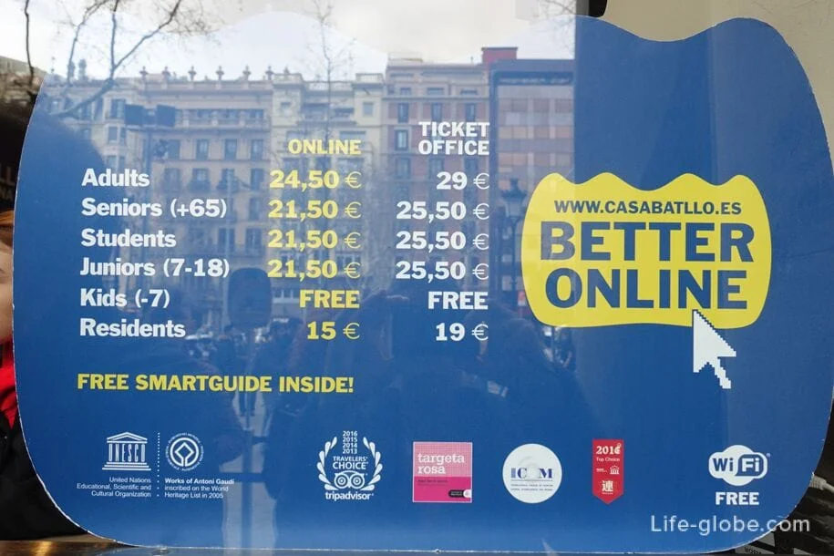 Стоимость обычного билета на посещение дома Бальо онлайн составляет 35 Евро, в кассе – 39 Евро.