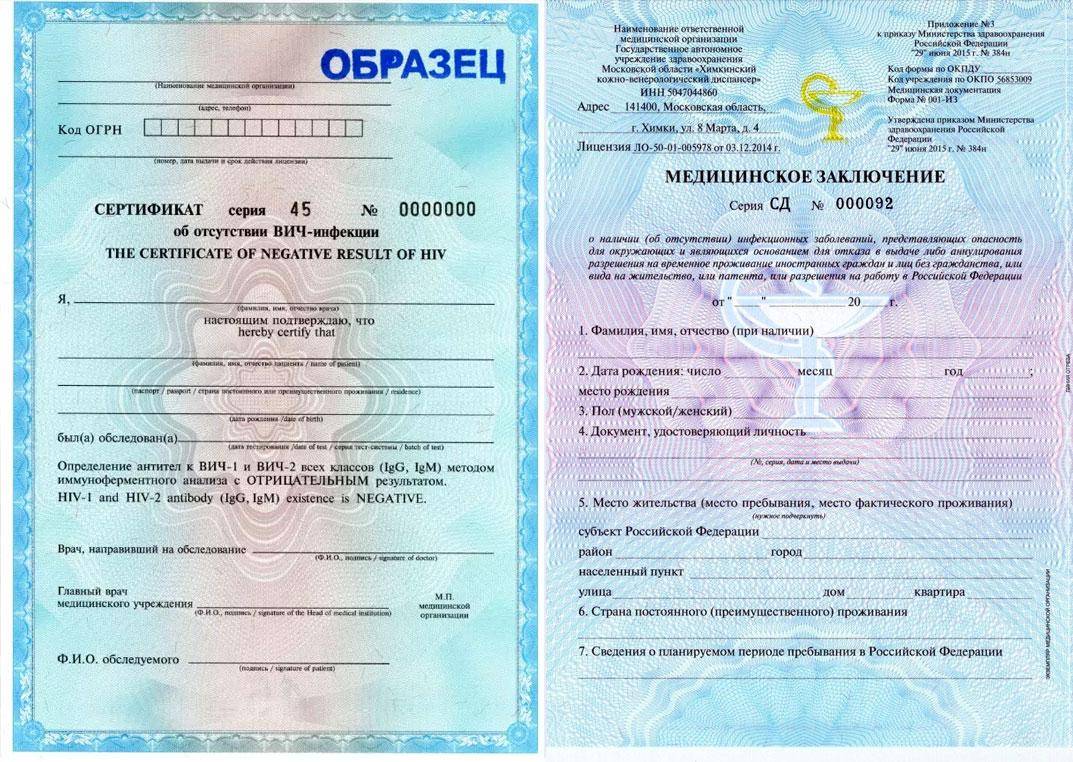 В первом случае заявитель получает на руки два документа государственного образца – медицинское заключение об отсутствии заболеваний, которые могли бы представлять собой опасность для окружающих, а также сертификат, подтверждающий отсутствие у претендента ВИЧ-инфекции.