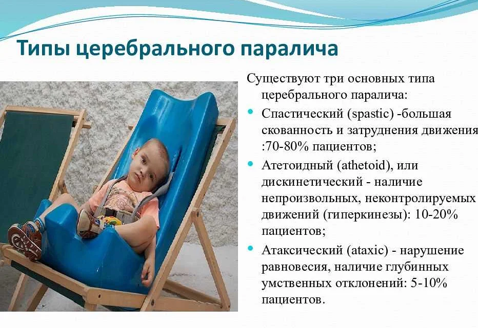 В зависимости от типа поражения анатомических структур центральной нервной системы и от клинической картины выделяют следующие типы детского церебрального паралича:
