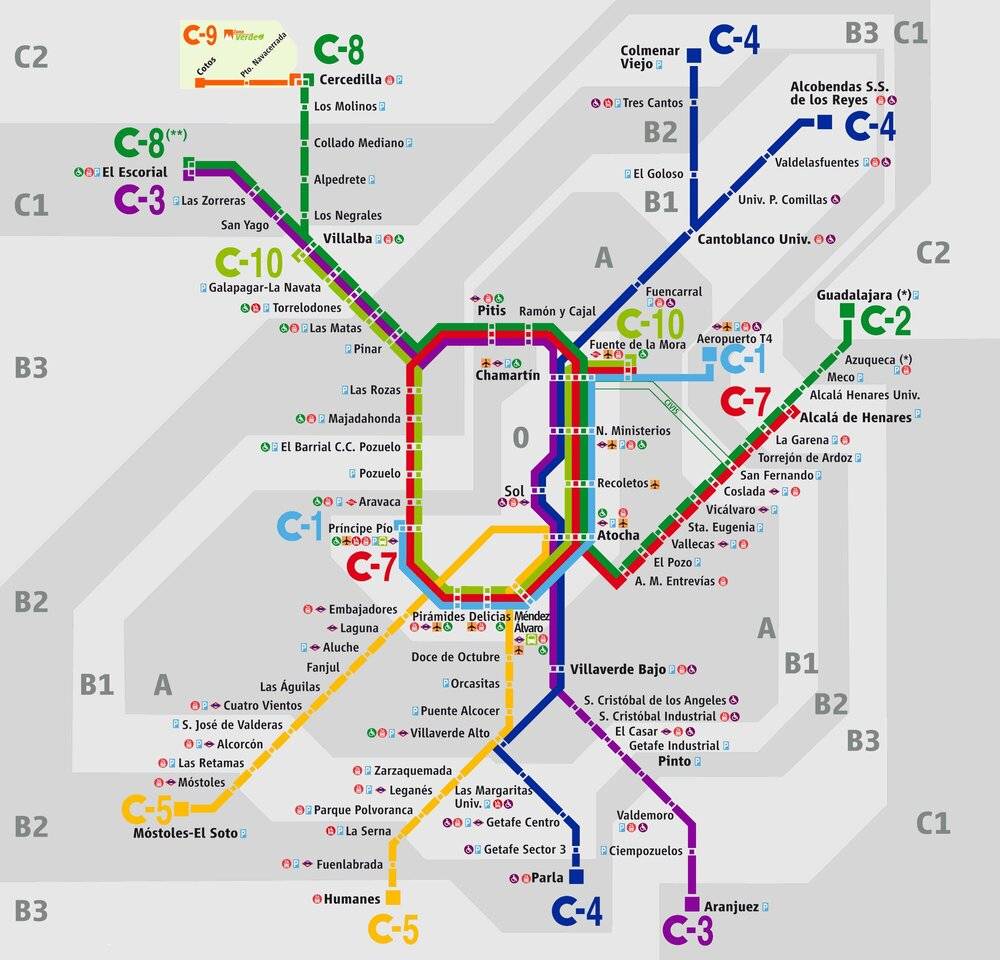 На электричках (в Испании они называются Cercanías) можно проехать всю провинцию Мадрид. Поезда ходят с 05:00 до 00:00. Билеты на электричку можно купить только на железнодорожных станциях: они не зачисляются на транспортную мультикарту.