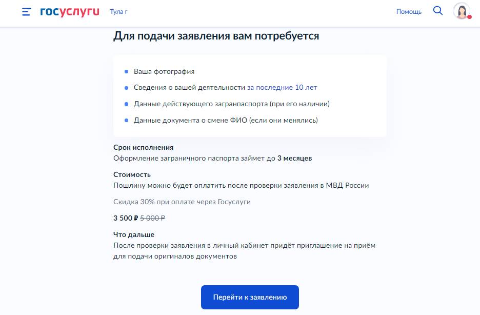 Шаг 5. В следующем окне кликаете «Перейти к заявлению». Заполняете его, описываете сведения о работе, учебе и т. д., загружаете фото.