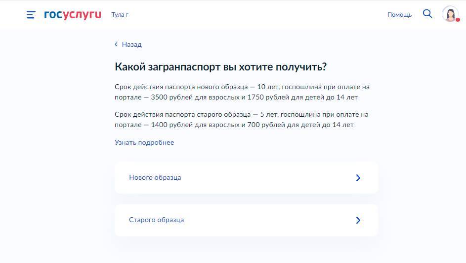 Шаг 2. Затем выбираете вид паспорта — нового или старого образца.