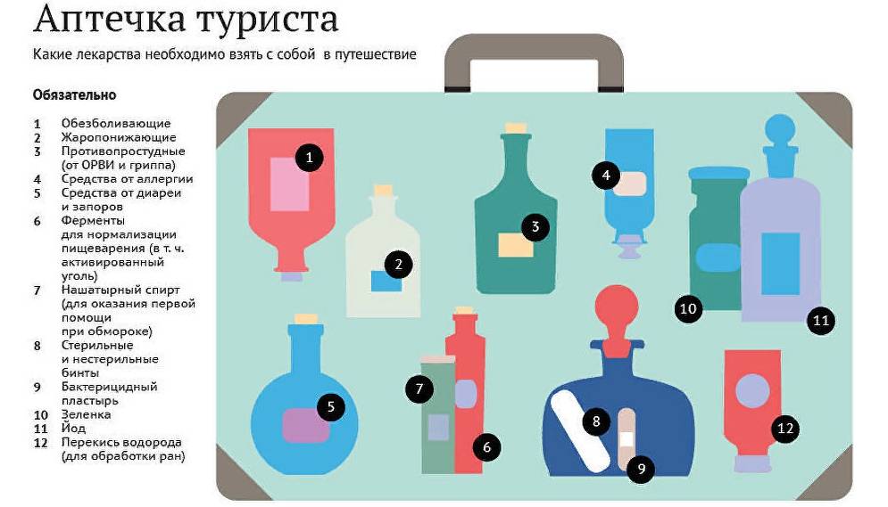 Это лекарства при простуде, от температуры, аспирин, капли для глаз при использовании линз, препараты от расстройства ЖКТ, заживляющие, противоаллергенные, обезболивающие (без кодеина), зеленка либо йод в форме карандаша (лучше с собой иметь их, чем перекись). Минимальный комплект лекарств допускается взять с собой, если пассажир перелетает по безбагажному тарифу и не хочет тратить деньги на оформление багажа, иначе лучше разделить количество средств и произвести отправку чемодана в багажном отделении.
