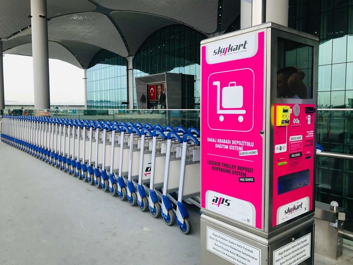 Возле автобусной остановки можно найти много тележек для багажа, но их нельзя взять просто так – тут работает депозитная система: оплачиваете 5 TL (монетами, купюрами или банковской картой), пользуетесь тележкой, ищите такой же автомат внутри аэропорта, сканируете билет, возвращаете тележку в ряд и забираете депозит. Внутри найти такой ряд сложнее и многие просто оставляют тележки в любом удобном месте, не возвращая депозит – получается неплохой дополнительный заработок для аэропорта.