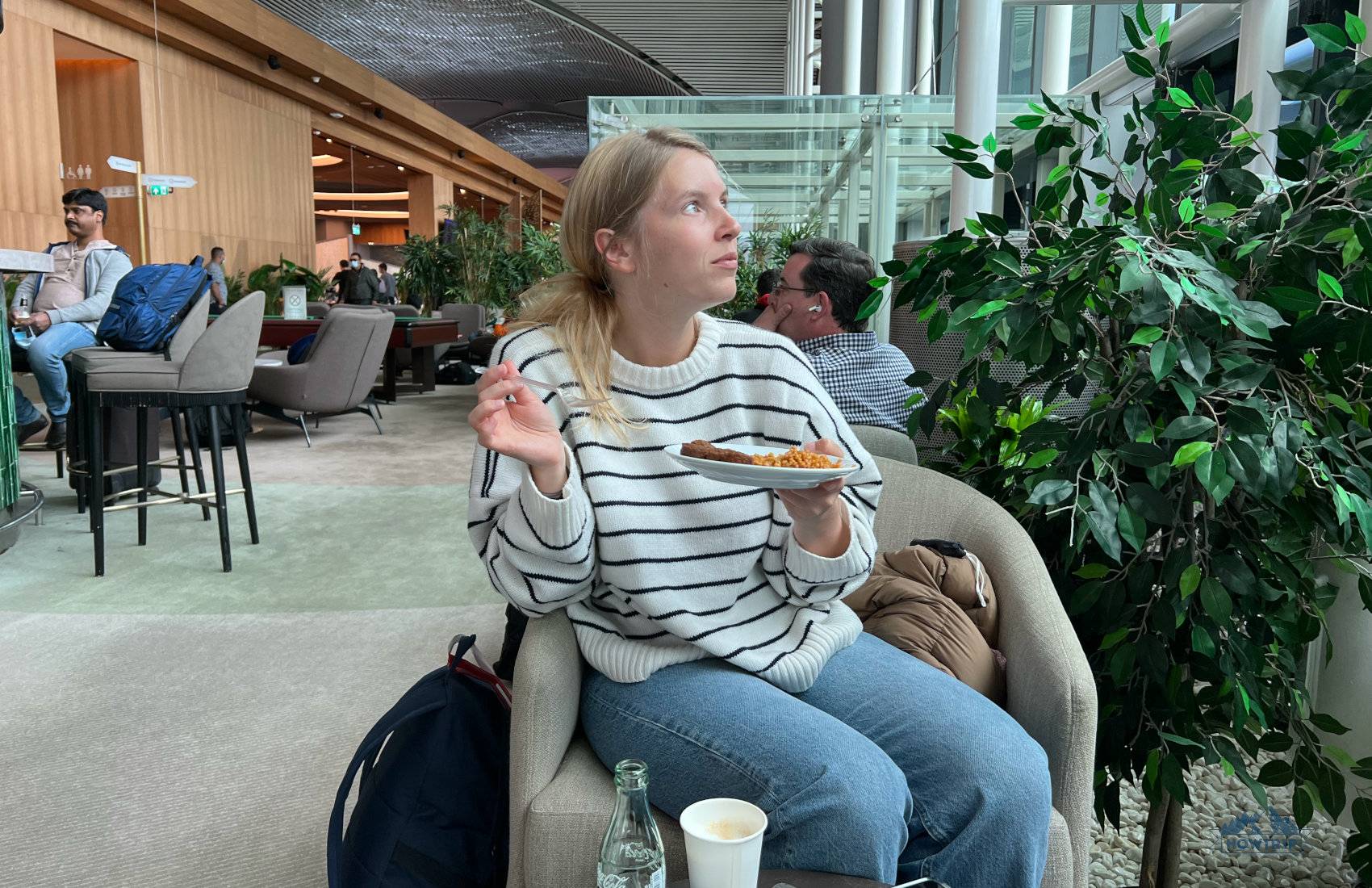 - IGA Lounge в международном терминале — в 2023 году доступен для владельцев карт с Priority Pass, но можно пробраться примерно за 45 евро с человека (цена часто меняется). Очень классный и просторный, но многолюдный — очереди выстраиваются и на входе, чтобы просто попасть, и за свежими лепешками гёзлеме в обеденной зоне