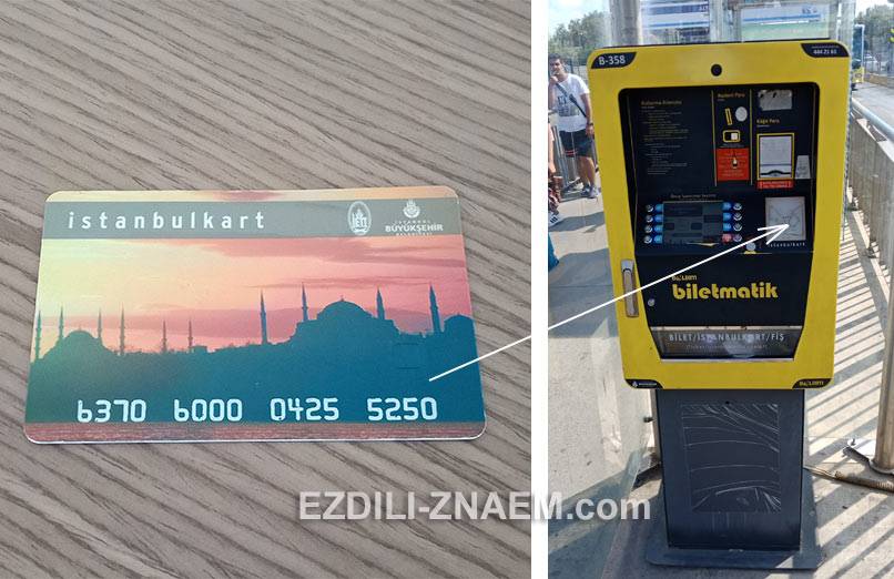 На фото: проездная карта “Istanbulkard” и автомат для пополнения в Стамбуле