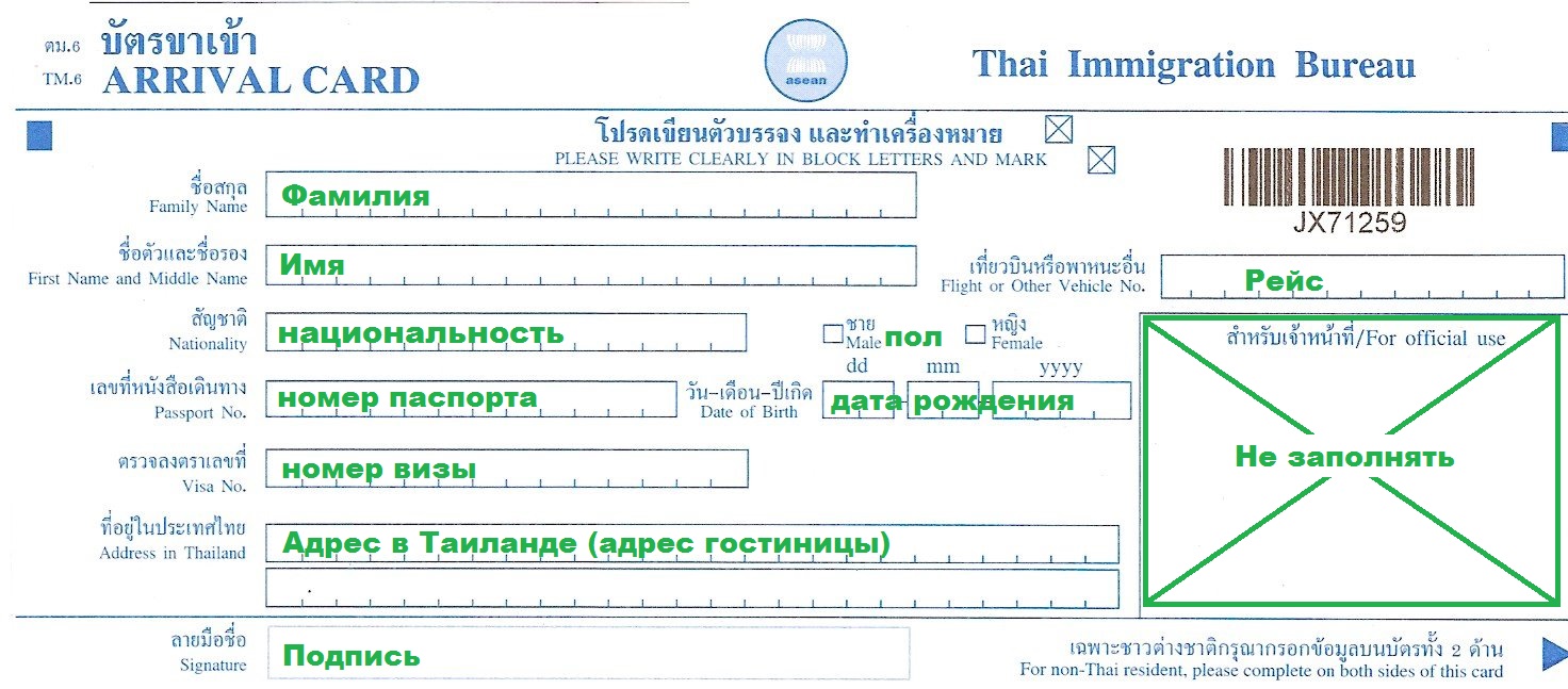 Образец заполненной оборотной стороны карты о прибытии в Таиланд