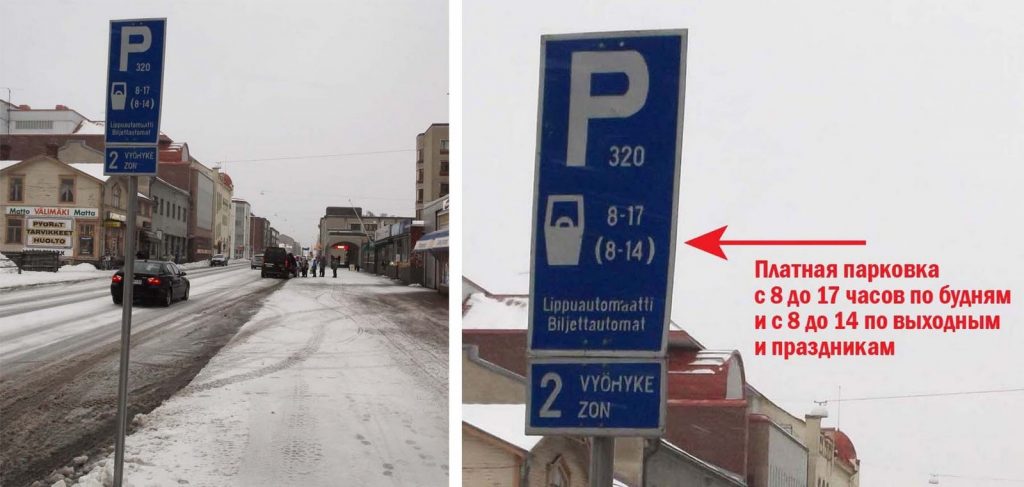Бесплатные парковки также подразделяются на обычные и с обязательным использованием парковочных часов. О необходимости использования парковочных часов можно узнать по соответствующей табличке, на которой они изображены. (Расшифровка дорожных знаков Финляндии)