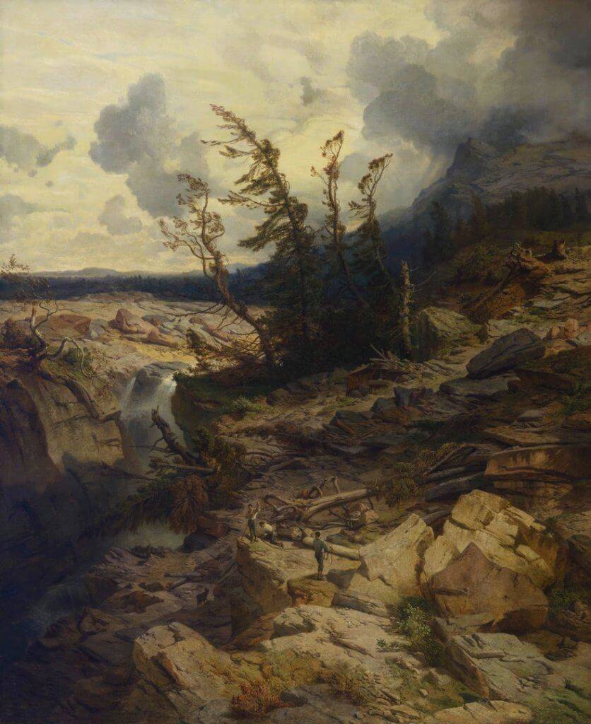 Альберт Циммеран (1808-1888) выбирал мотивы для своих грандиозных пейзажей, отдавая предпочтение горной природе и используя иногда события из библейской истории. Художник писал портреты природы с поэтическим освещением и идиллическим настроением.