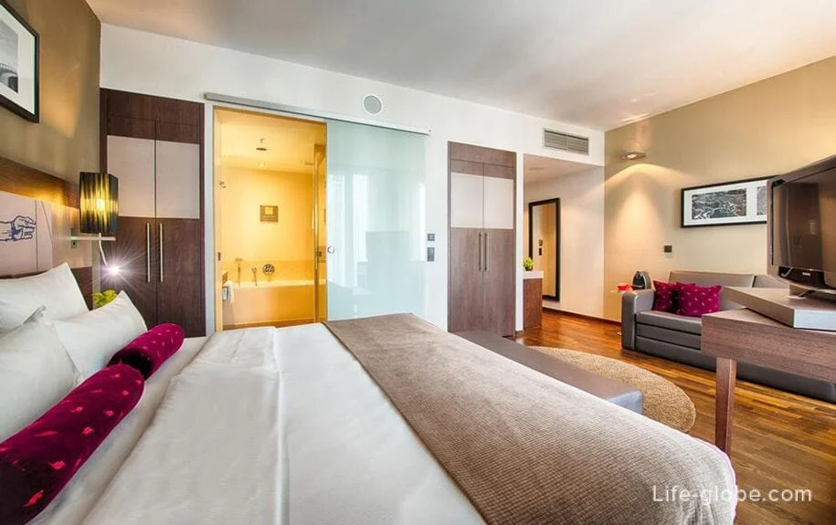 Заведение имеет очень выгодное месторасположение, в отличном районе Леэль, который делает это место отличным выбором для тех, кто хочет насладиться королевским отдыхом и беззаботным времяпребыванием в сказочном месте. В летний сезон постояльцы по достоинству оценят бассейн на крыше комплекса, в котором плавать и наслаждаться удивительным панорамным пейзажем Мюнхена одно удовольствие. Этажом ниже находится фитнес и спа центры, в которых установлено самое современное оборудование.