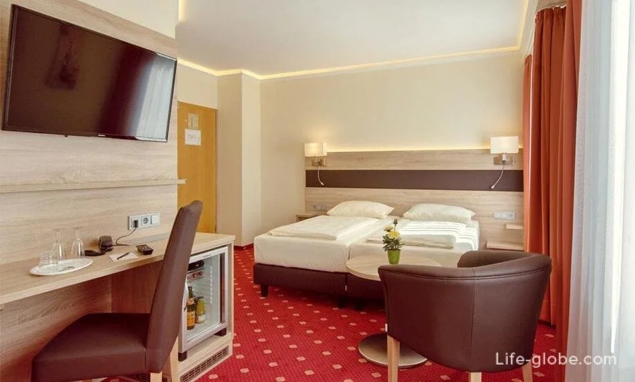 За весьма соблазнительную сумму вам предлагается размещение в больших номерах, с системой очистки и охлаждения воздуха, отличной звуко и свето изоляцией, всевозможными бытовыми современными атрибутами. Интерьер весьма сдержанный, но очень богатый, в котором использовалось только натуральные материалы. Утолить свой голод можно в небольшом зале, где каждое утро вас будет ожидать обильный шведский стол, который состоит исключительно из натуральных фермерских продуктов. Вас очень порадует тот факт, что персонал отеля говорит на русском. Идеальное место для тех, кто предпочитает насыщенный и демократичный отдых в сердце Мюнхена.