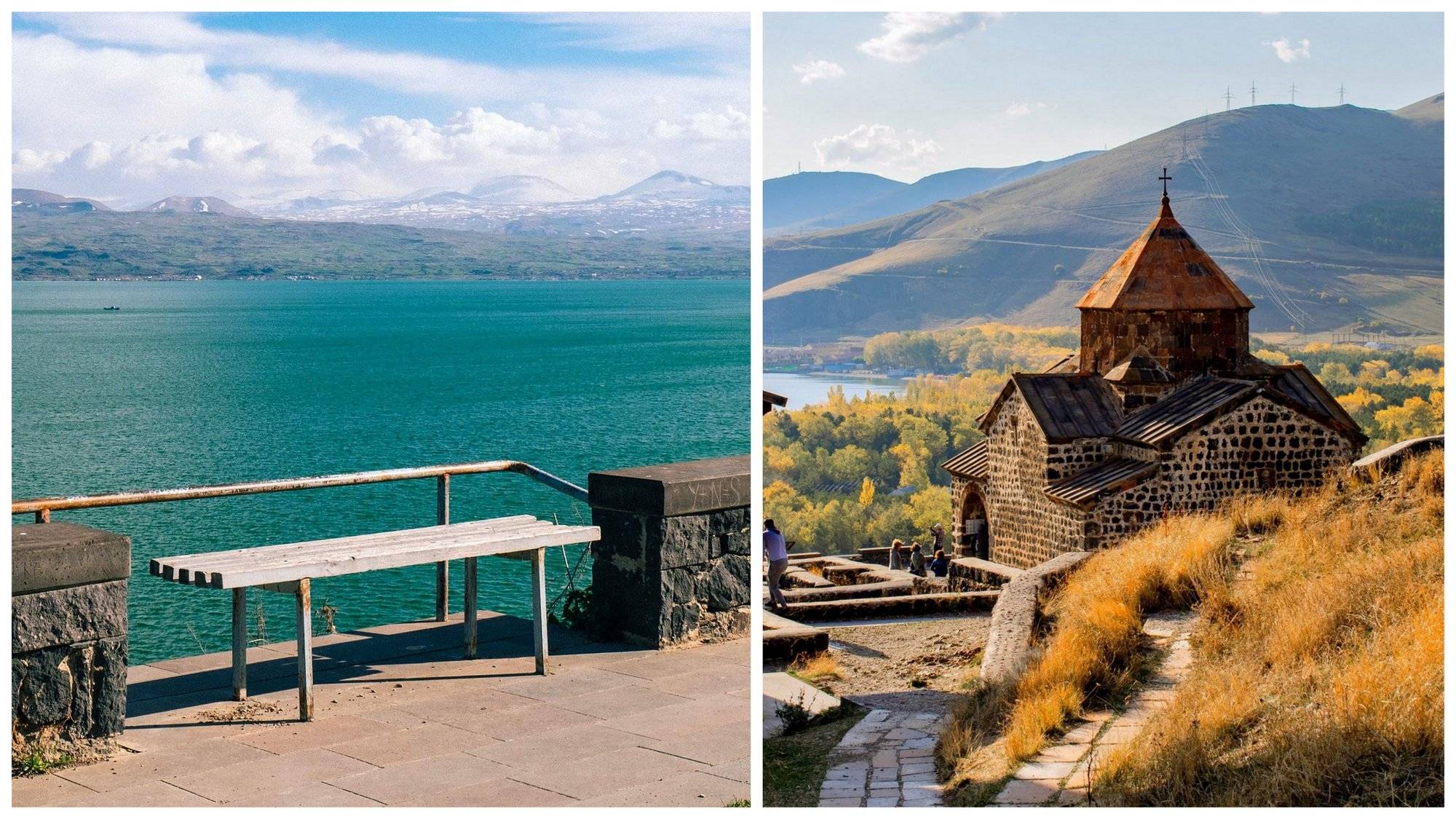 Крупнейшее озеро Кавказа и одноименный город расположены на Армянском нагорье. Летом озеро прогревается до плюс 24 градусов, поэтому в нем можно купаться. В более холодные времена года можно прогуляться по полуострову Севан, на котором расположен древний монастырь Севанаванк 874 года. Блоки черного вулканического туфа покрыты копотью от свечей, а единственные яркие пятна — это позолоченный иконостас и иконы.