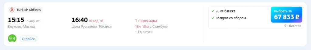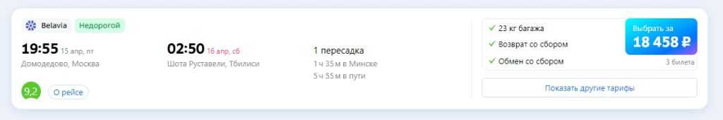 На самолете. Прямых рейсов в Грузию нет с 2019 года. Перелет из Москвы в Тбилиси с пересадкой в Армении, Беларуси или Турции в мае – июне 2022 обойдется в 18 – 30 тыс. руб. с багажом. Если планировать заранее, можно купить билеты за 13 – 15 тыс. руб.
