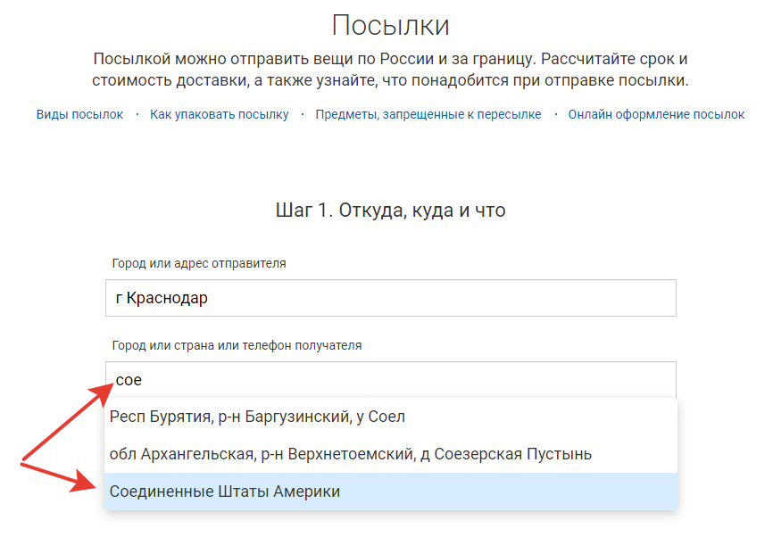 После регистрации или входа нужно будет выбрать «Отправить» – «Посылку» и в появившиеся окошки ввести город или адрес отправителя, страну получателя, вес отправления.