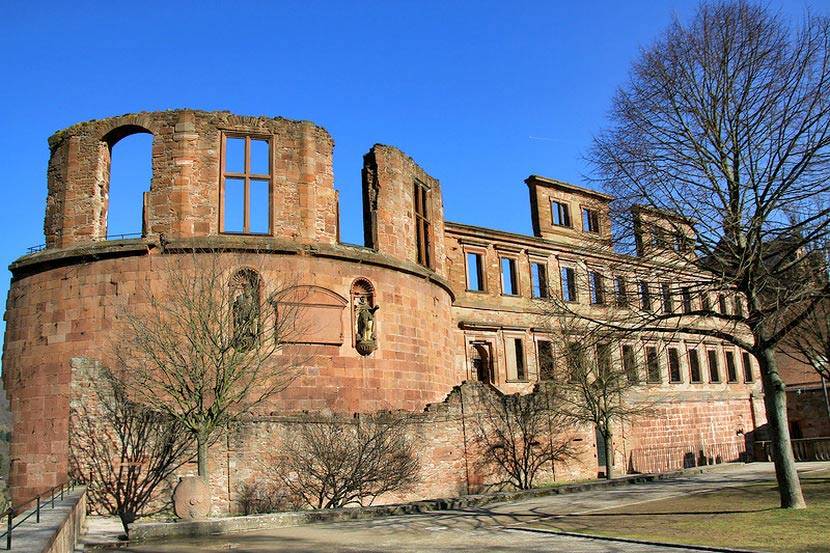 В самой старой части замка, называемой в туристических проспектах крылом Рупрехта, современные туристы могут увидеть камин, относящийся еще к эпохе Возрождения. Вход в эту часть замка украшают скульптуры ангелов. Естественно, наибольший интерес вызывает отреставрированное крыло Фридриха, фасад которого украшен многочисленными и качественно выполненными скульптурами курфюрстов. Кроме этого сохранились до наших дней и остатки двух некогда величественных террас сада Hortus Palatinus. Увы, почти все прекрасные фонтаны, беседки, бассейны были разрушены еще во время «шведского артиллерийского обстрела».