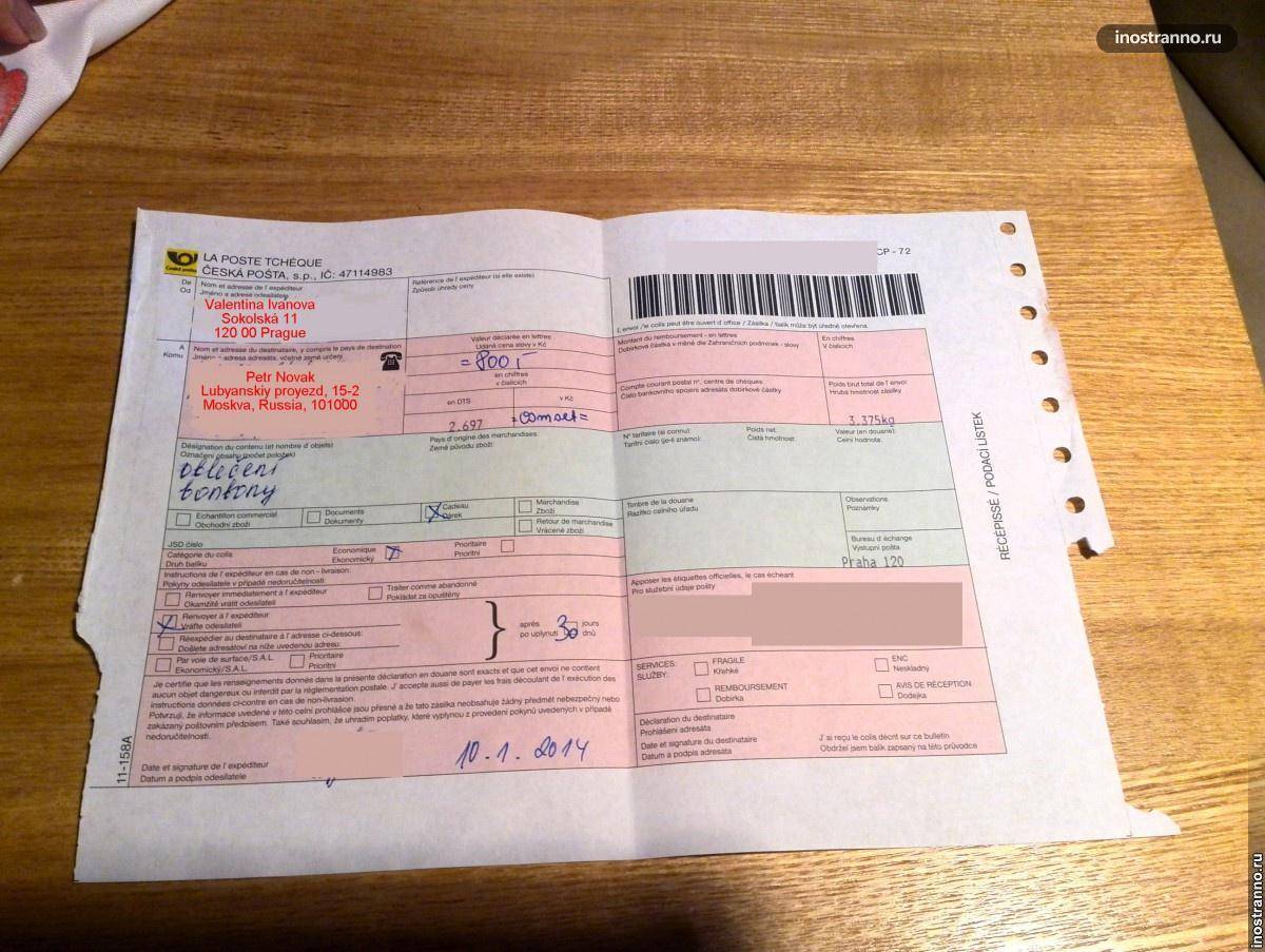 Остальные отметки делает сотрудник почты. В нижней части бланка необходимо проставить свою подпись. В правой верхней части бланка указывается идентификационный номер посылки, по которому вы можете отследить ее перемещения по Чехии на сайте чешской почты . После того, как посылка покинет территорию Чехии, ее надо отслеживать уже на сайте Почты России или другой страны назначения.