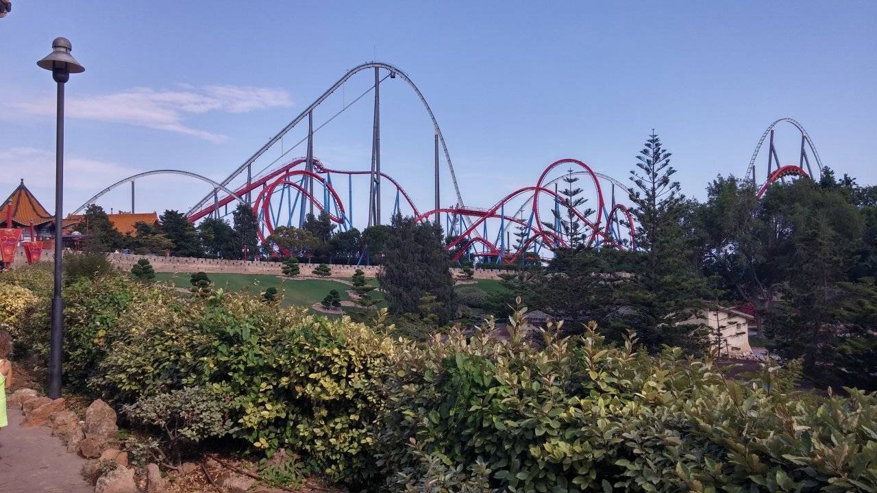 Самые популярные горки Порта Авентура расположены в китайском районе. Одна из них — Дракон Хан. Он уникален тем, что мчится на высокой скорости и имеет 8 мертвых петель. Правда после поездки на Драконе может кружиться голова.
