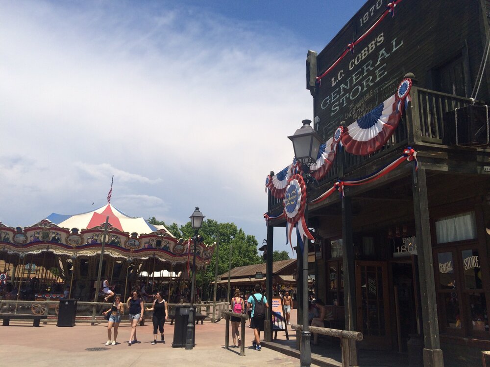 В этой части парка все напоминает времена освоения Дикого Запада Америки. Ковбойский дух, американские пейзажи, дома, музыка и пр. Особый интерес в данной тематической зоне вызывают следующие аттракционы: Silver River Flume, Stampida, Tomahawk, Grand Canyon Rapids.
