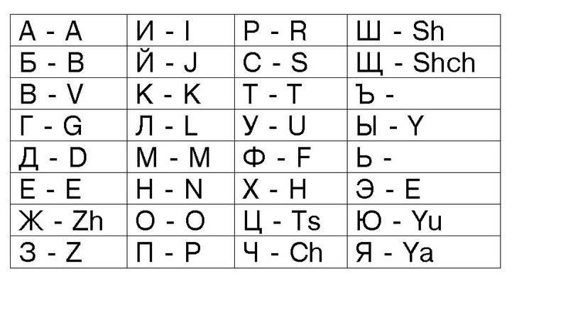 а — a б — b в — v г — g д — d е — e ё — e ж — zh з — z и — i й — i к — k л — l м — m н — n о — o п — p р — r с — s т — t у — u ф — f х — kh ц — ts ч — ch ш — sh щ — shch ъ — ie ы — y э — e ю — iu я — ia