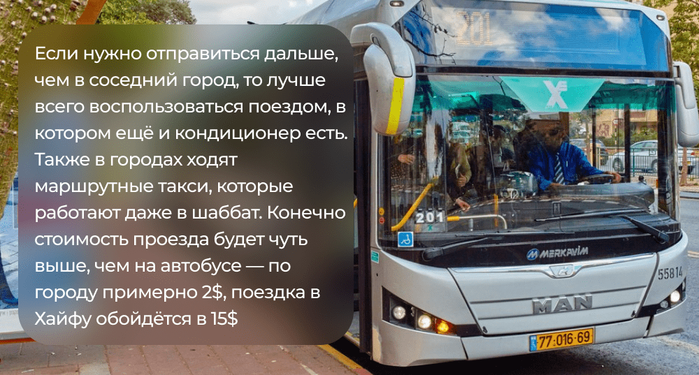 Автобусный парк в Израиле обслуживают две крупные компании: Эгед и Дан. Стоимость проезда будет зависеть от района. Передвигаясь по Тель-Авиву или Иерусалиму придётся платить от полутора долларов за поездку, проездной на месяц выйдет в 60 долларов.