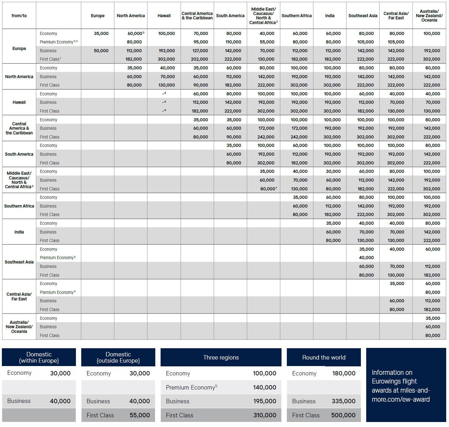 The award chart also has separate pricing for domestic flights (within and outside of Europe), flights using 3 regions, and “Round the World” itineraries.