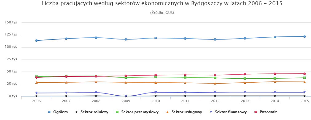 0,7% занятого населения Быдгоща работают в аграрном секторе (сельское хозяйство, лесное хозяйство, охота и рыболовство), 30,9% заняты в промышленности и строительстве и 24,1% – в сфере услуг (торговля, ремонт автомобилей, транспорт, гостиничное обслуживание и общественное питание, информация и коммуникации). 6,7% работают в финансовом секторе (финансовая и страховая деятельность, услуги по недвижимости).