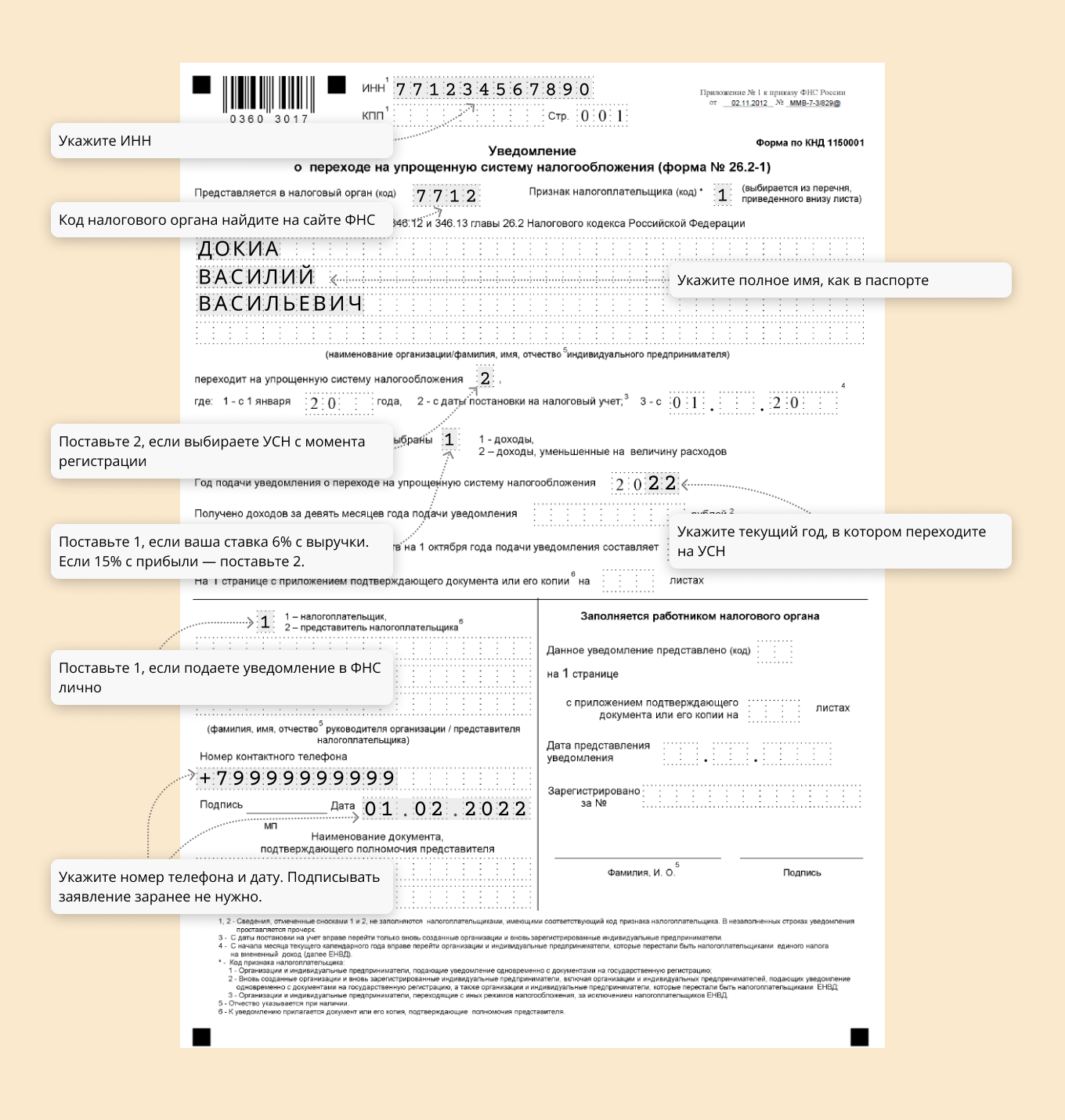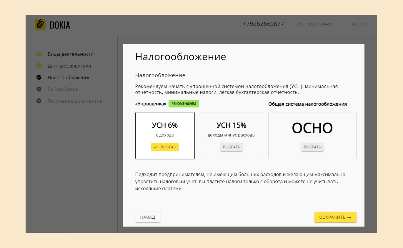 При регистрации ИП самостоятельно не обязательно заполнять форму на УСН вручную. Если использовать для подготовки документов конструктор Dokia, можно выбрать налоговый режим, а уведомление сервис заполнит самостоятельно. Быстро и без ошибок.