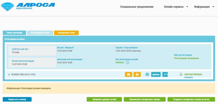 Если все данные введены верно, то искомый билет будет найден в системе и пассажир увидит всю информацию о рейсе и том, кто путешествует (даты и время вылета и прилёта, маршрут, тип воздушного судна, время начала и окончания онлайн-регистрации, данные пассажира и т.д). Если нет — то имеются какие-то ошибки, которые нужно исправить. В случае же, если клиент перепроверил информацию и уверен, что ошибок нет, а сайт всё равно отказывает ему, то следует обратиться в службу поддержки авиакомпании.