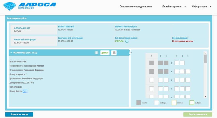 В третьей графе поставьте дату вылета, а в самой последней указывается номер рейса, который состоит из одних цифр. Регистрируясь, нажмите поиск и убедитесь в правильности заполненных данных. До момента выбора мест можно изменить информацию, если она была указана неверно в маршрутной квитанции.