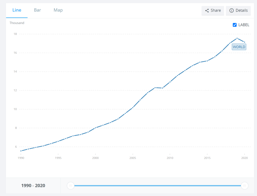 ВВП на душу населения в мире по итогам 2020 года составил $17 135, снизившись относительно показателя 2019 года в $17 548 из-за пандемии коронавируса COVID-19.