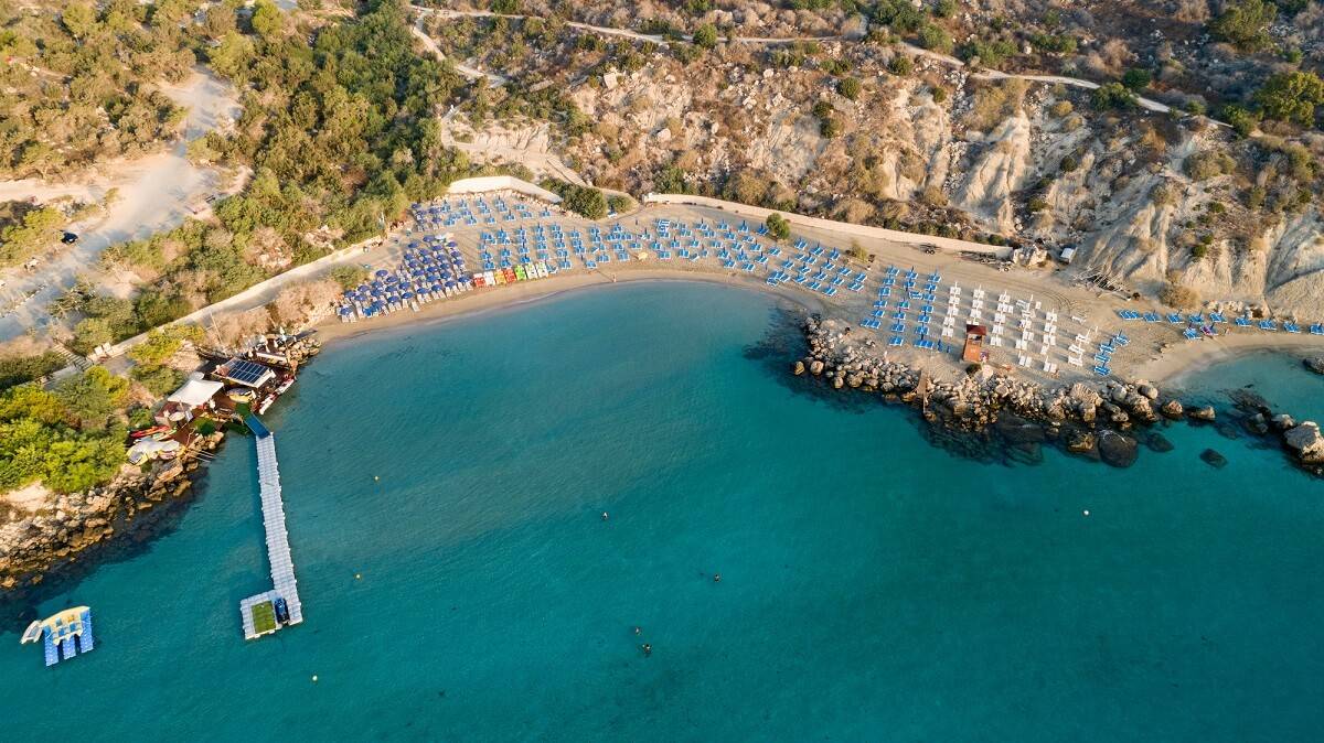 преодолев 30 км от курорта Лимассол. На берегу расположено множество уютных таверн с традиционными блюдами. Отдыхающие могут насладиться бархатистым белым песком в окружении