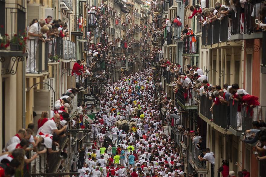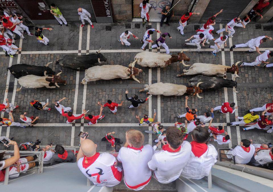 Каждое утро ровно в 8 утра звучит сигнал, отворяются ворота корраля, и обезумевшие от нежданной свободы быки устремляются вдоль по улицам к стадиону. Перед быками несется очумелая толпа мужчин, пожелавших «поиграть» с бычьими рогами и копытами. В эти дни затаптывают и поднимают на рога ни одного и не двух — однако это не останавливает испанцев сводить счеты с жизнью, проверять свою храбрость и скоростные качества — доказывать, что они смельчаки. Почти километровую дистанцию огораживают деревянными щитами — это становится своеобразным прологом к самой корриде. У каждого бегуна в руках свернутая трубочкой газетка — это все «оружие», которое им разрешено использовать.