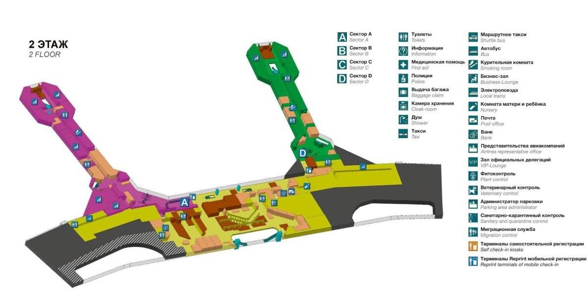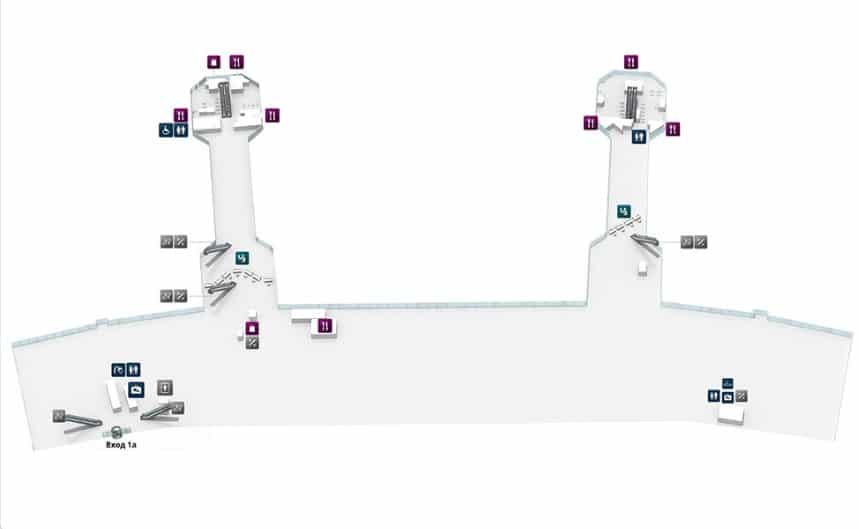 Комплекс предлагает достойные условия ожидания самолета. Здесь доступны комфортные стойки для прохождения контроля, заведения питания разных форматов, удобные и широкие залы ожидания, приятные сотрудники, которые обеспечивают путешественников необходимыми удобствами. Изучим, как выглядит карта авиаузла с нанесенными туда заведениями.