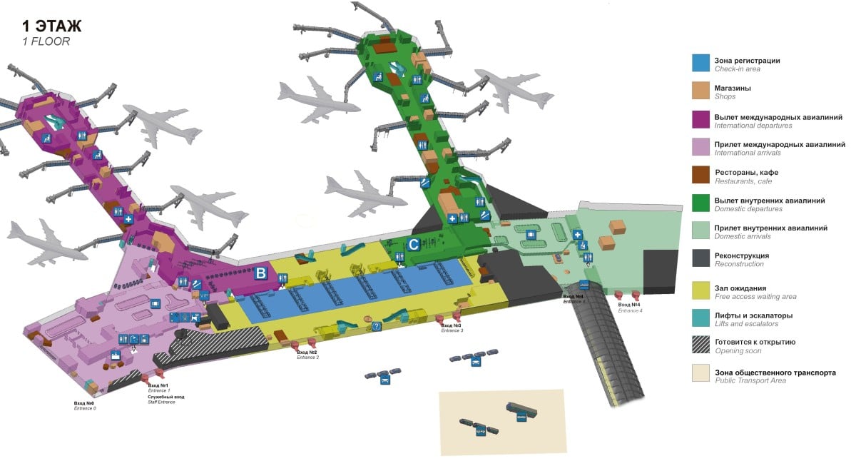 Несмотря на условное зонирование внутреннего пространства, 1 этаж аэровокзала является единым целым, то есть попасть из зоны вылета в зону прилета можно и внутри здания.