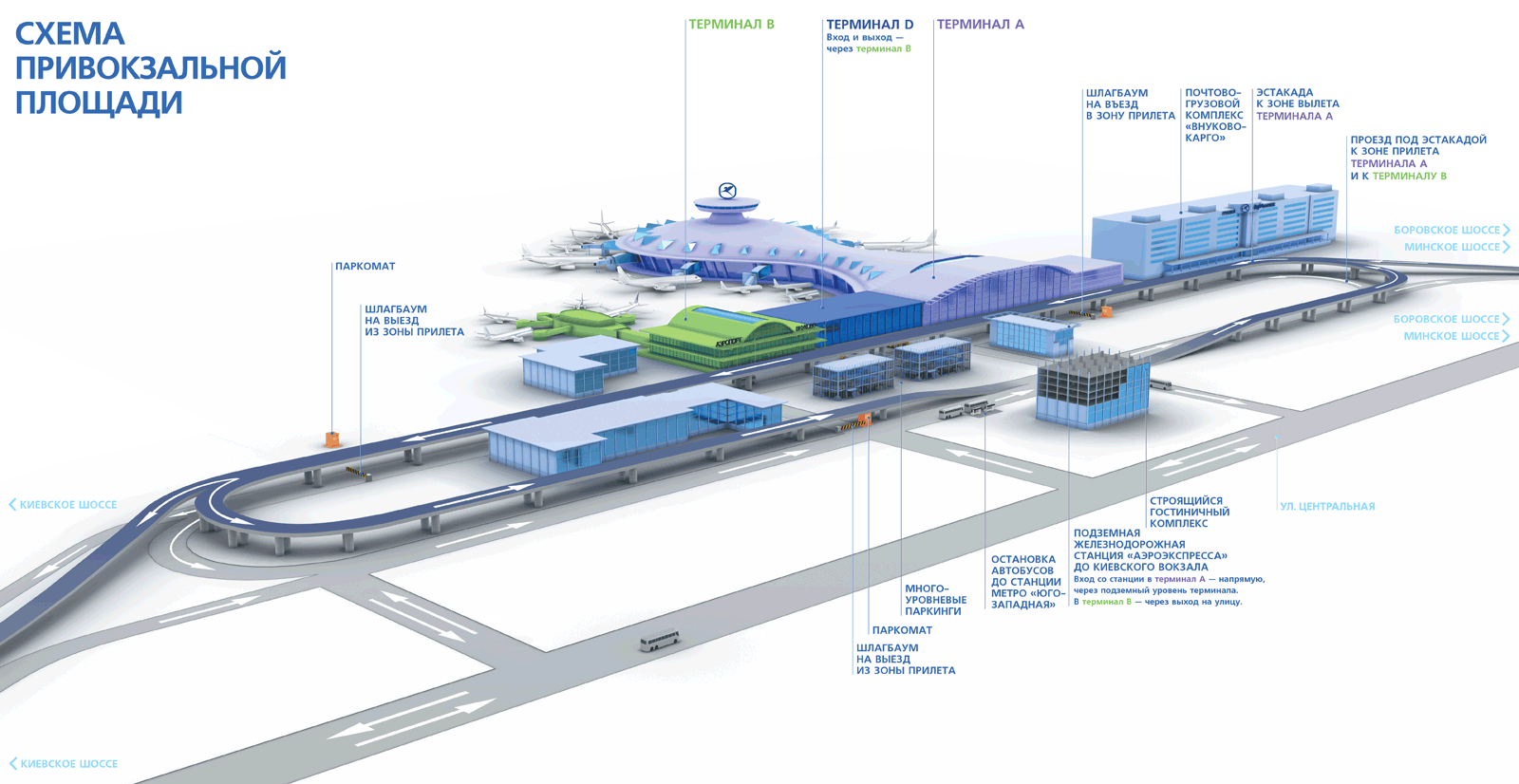 Парковки около аэропорта, на привокзальной площади, предлагают размещение 400 автомобилям. На эту парковку ближе всего заехать с Боровского шоссе. Также есть заезд с Киевского шоссе.