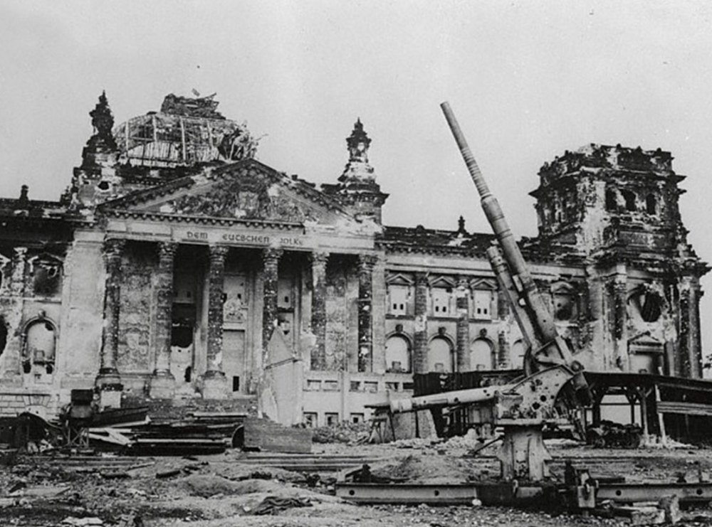 В 1945 году Рейхстаг был практически полностью уничтожен, а на его обломках советские солдаты установили свое знамя.