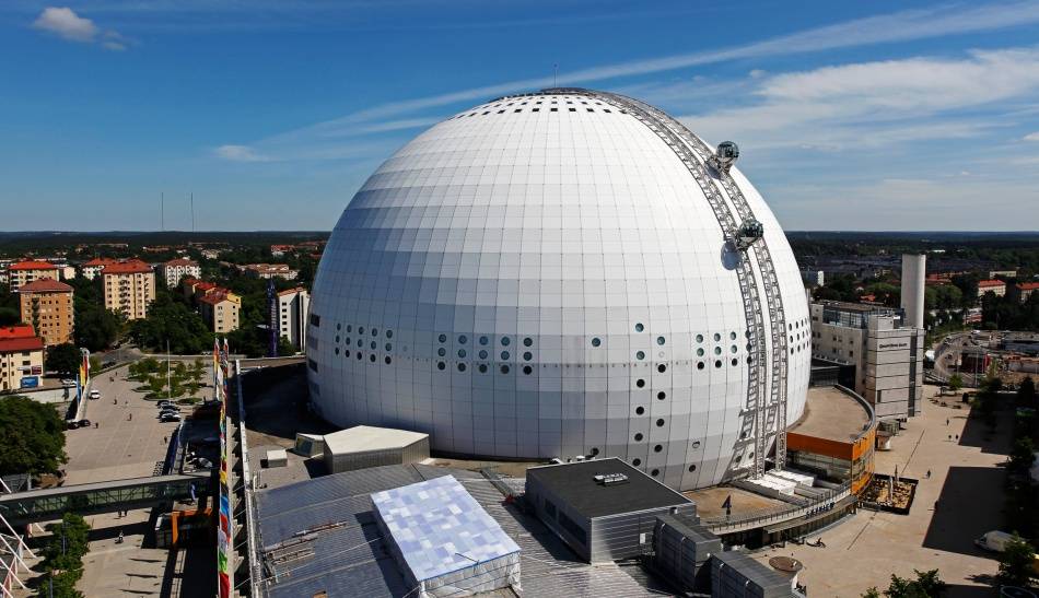 – площадка для спортивных состязаний и концертов мирового уровня – современное здание с огромным сферическим куполом, на вершину которого ходит специальный капсульный фуникулер. Высшая точка фуникулера находится на высоте птичьего полета и открывает панорамы Стокгольма как на ладони.