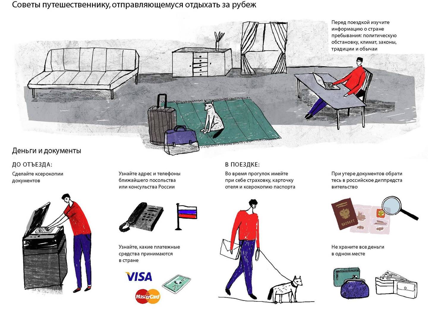 Желательно сделать копии всех основных документов для выезда за границу (паспорта, водительского удостоверения, страховки, приглашения, туристической путевки и так далее) и взять их с собой, сложив в отдельную папку. На всякий случай можно подготовить нотариально заверенную копию российского паспорта (страницу с фотографией, регистрацией и личными данными). Сам документ лучше оставить дома. Все эти копии понадобятся на случай утери какого-либо документа. К примеру, если потеряется загранпаспорт, то следует обратиться в российское посольство, а сделанные заранее копии упростят и ускорят процедуру выдачи временного свидетельства.