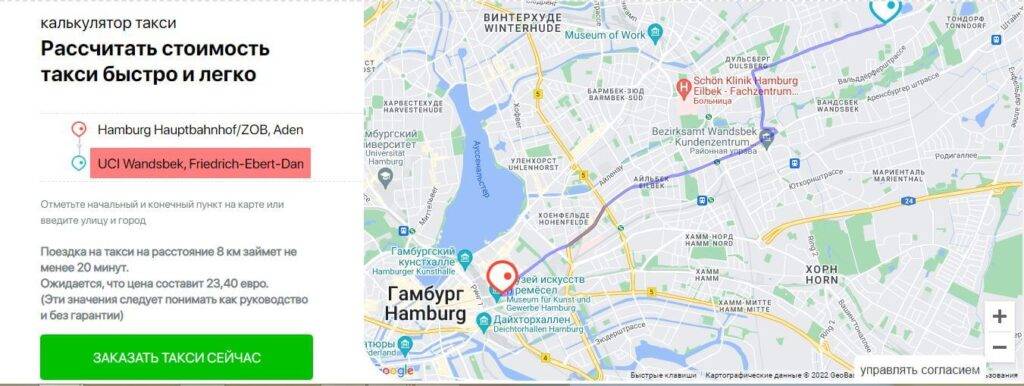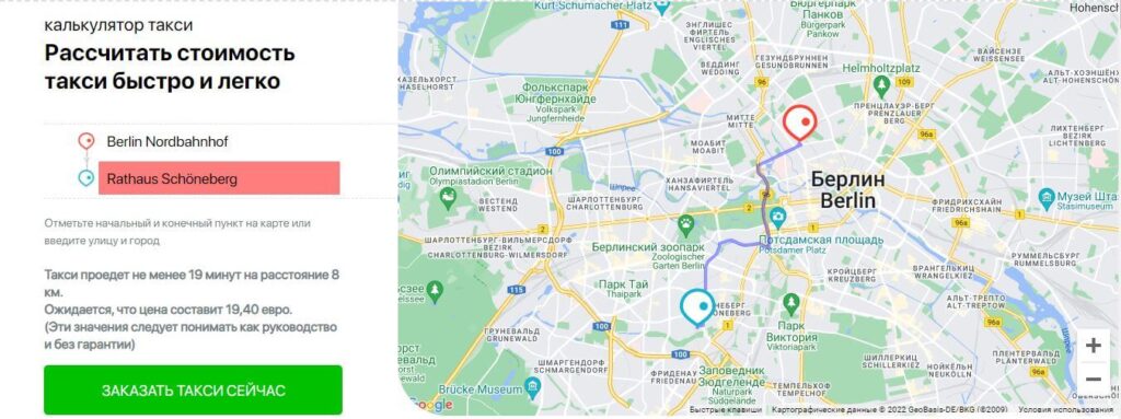 На изображениях ниже Вы можете увидеть стоимость поездки на примере сайта taxi.de. Возьмем несколько городов, а именно Берлин, Гамбург, Кёльн, Дюссельдорф и Мюнхен и от вокзала проедем приблизительно до 10 км пути. На фото Вы можете увидеть цену поездки и понять для себя, сколько стоит такси в Германии.