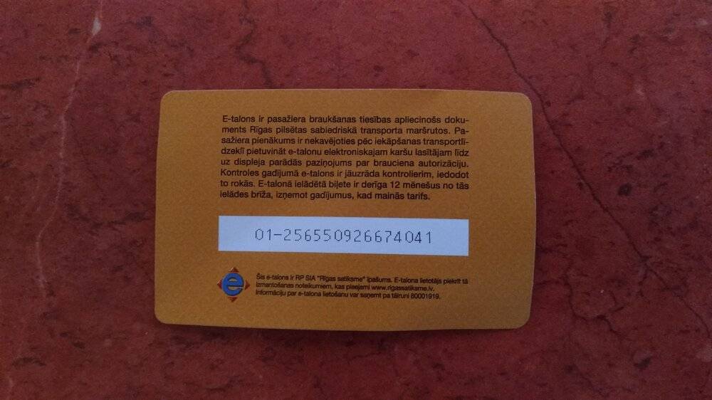 В рижском транспорте действует единый билет — э-талон. Это специальная электронная карта, которую пополняют на нужное время или количество поездок. При посадке на общественный транспорт билет прикладывают к валидатору, который регистрирует поездку: зеленый — зарегистрирована, красный — отказано.