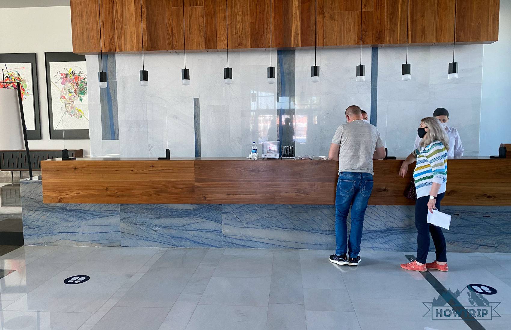 Ресепшн отеля в Турции отделен стеклами, а сотрудники все в масках